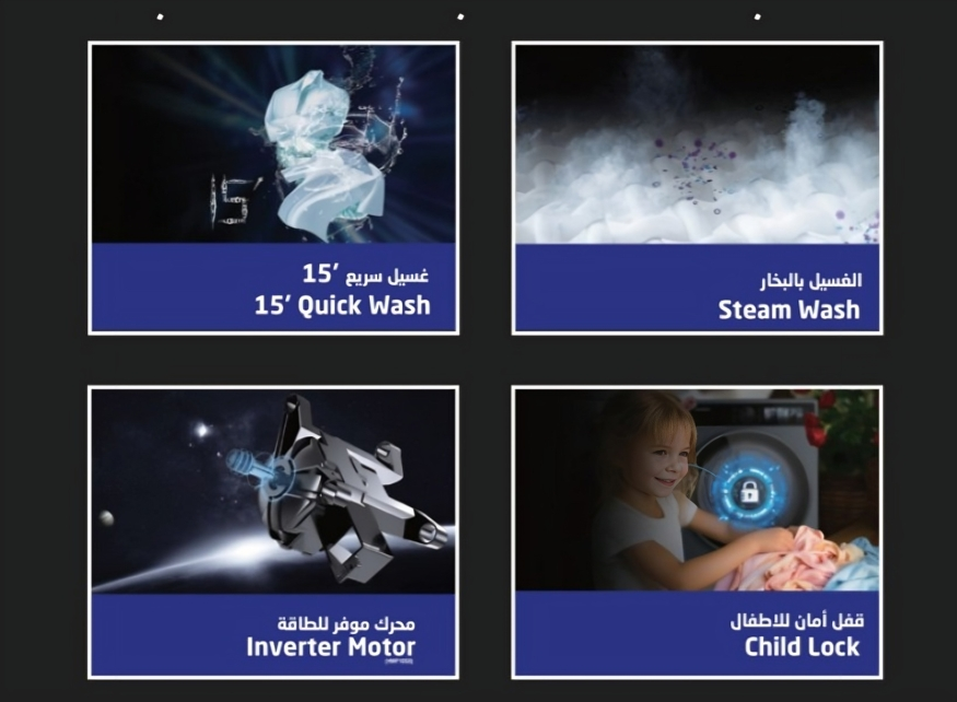 انفرتر موفر للطاقة - غسيل سريع 15 - الغسيل بالبخار - نظام غسيل ذكي - موازنة تلقائية - كشف الحمولة - استشعار الرغوة وإزالتها - خيار الماء الساخن والبارد - إعادة التشغيل التلقائي - تأخير مسبق/تأخير زمني - تنظيف الحوض - قفل ضد عبث الأطفال - مؤشر قفل الباب