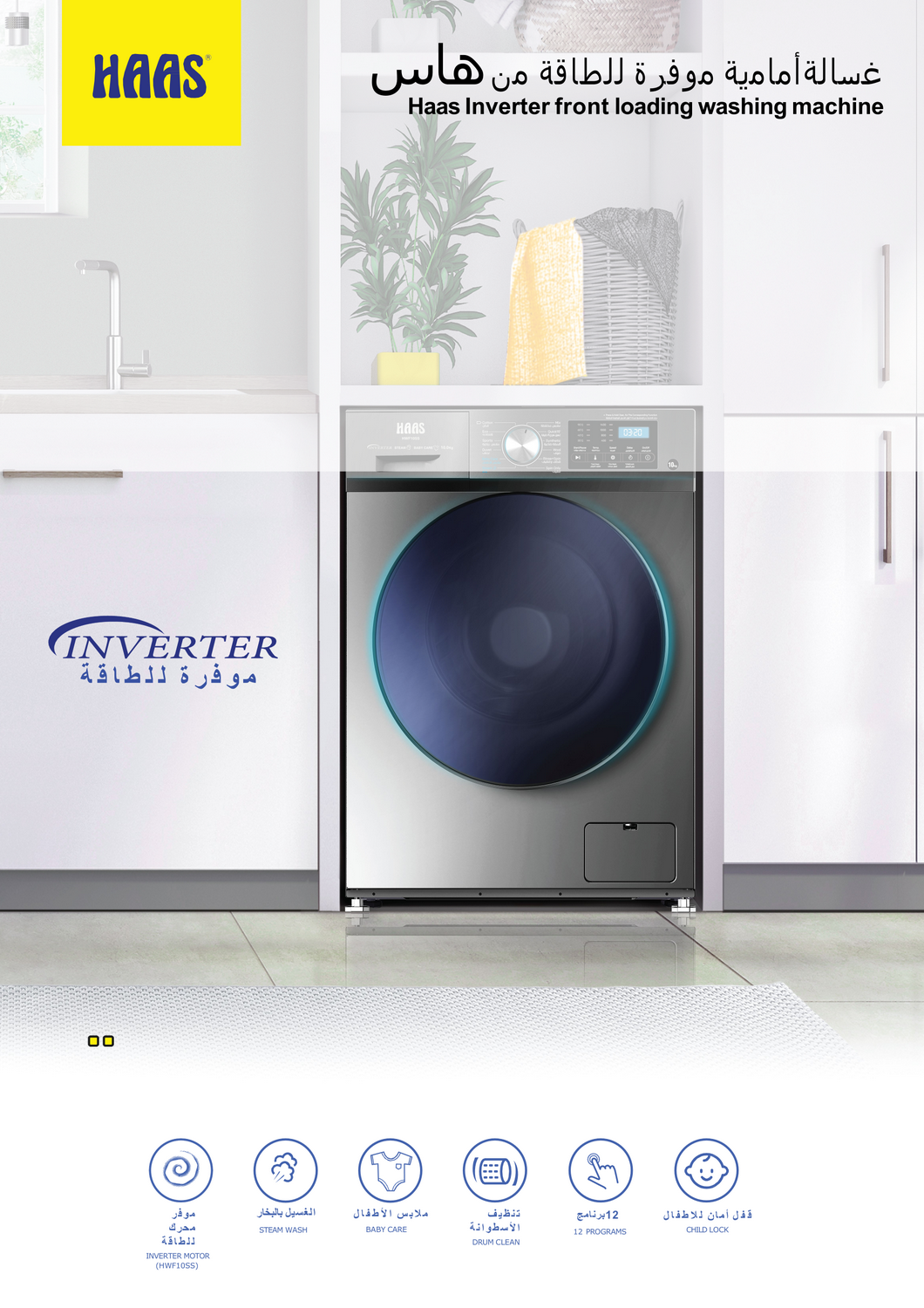 غساله اوتوماتيك فتحة امامية هاس 10 كيلو 12 برنامج انفرتر تيتانيوم