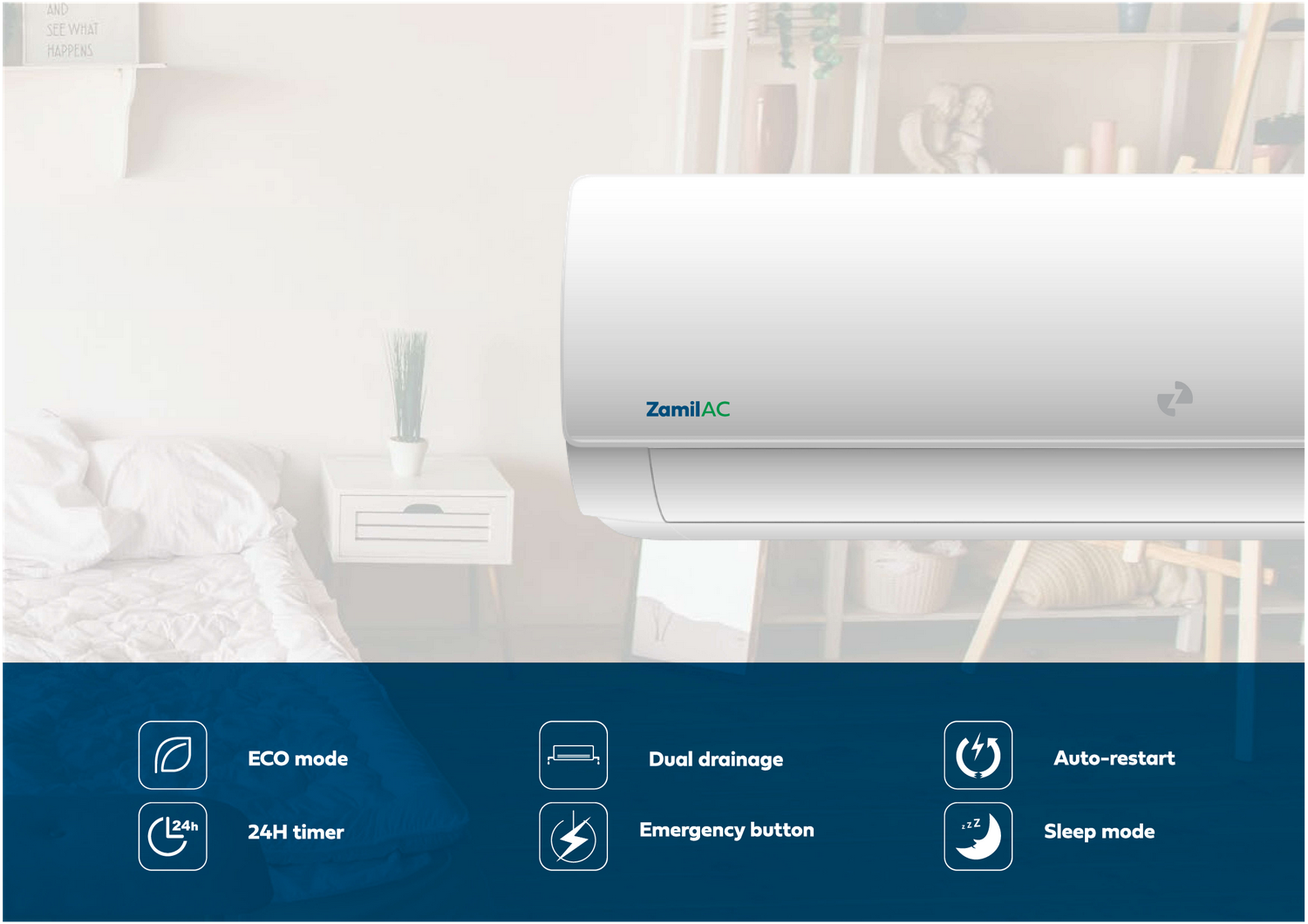 فلتر غبار مضاد للبكتيريا - توزيع الهواء 4 اتجاهات - توقيت 24 ساعة - إعادة التشغيل التلقائي - وضع السكون - تصريف مزدوج - التشخيص الذاتي
