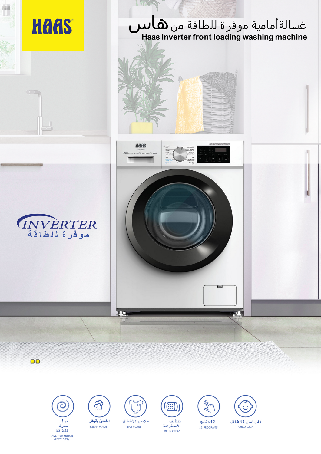 غساله اوتوماتيك فتحة امامية هاس 8 كيلو 12 برنامج انفرتر ابيض